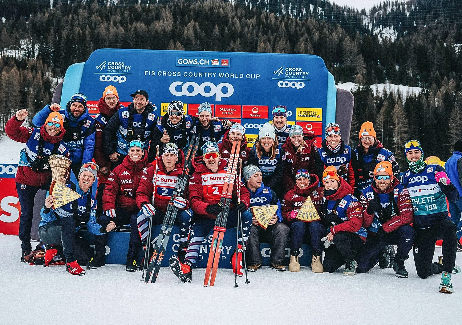 USA staff and athletes celebrating the historic third-place finish in Switzerland on Jan. 23. FIS